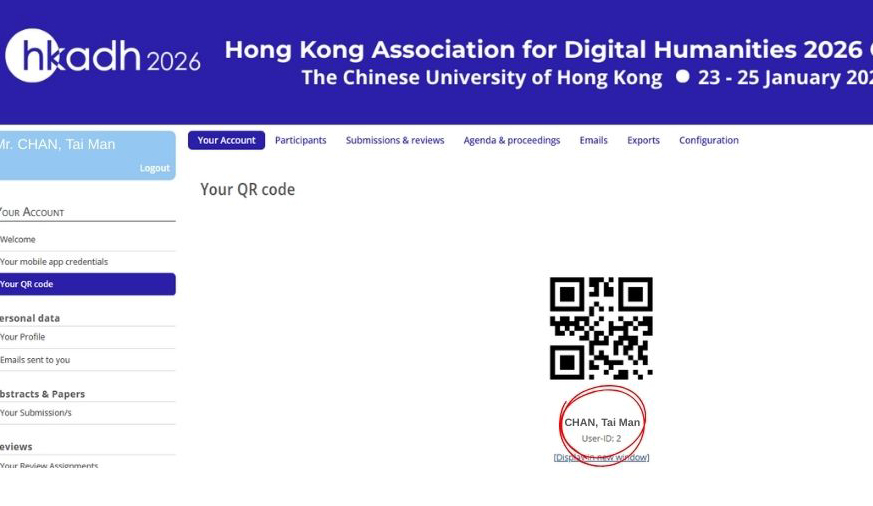 Please show the QR code from your HKADH 2026 account (https://coms.app/2026-hkadh/) or provide your user ID number.